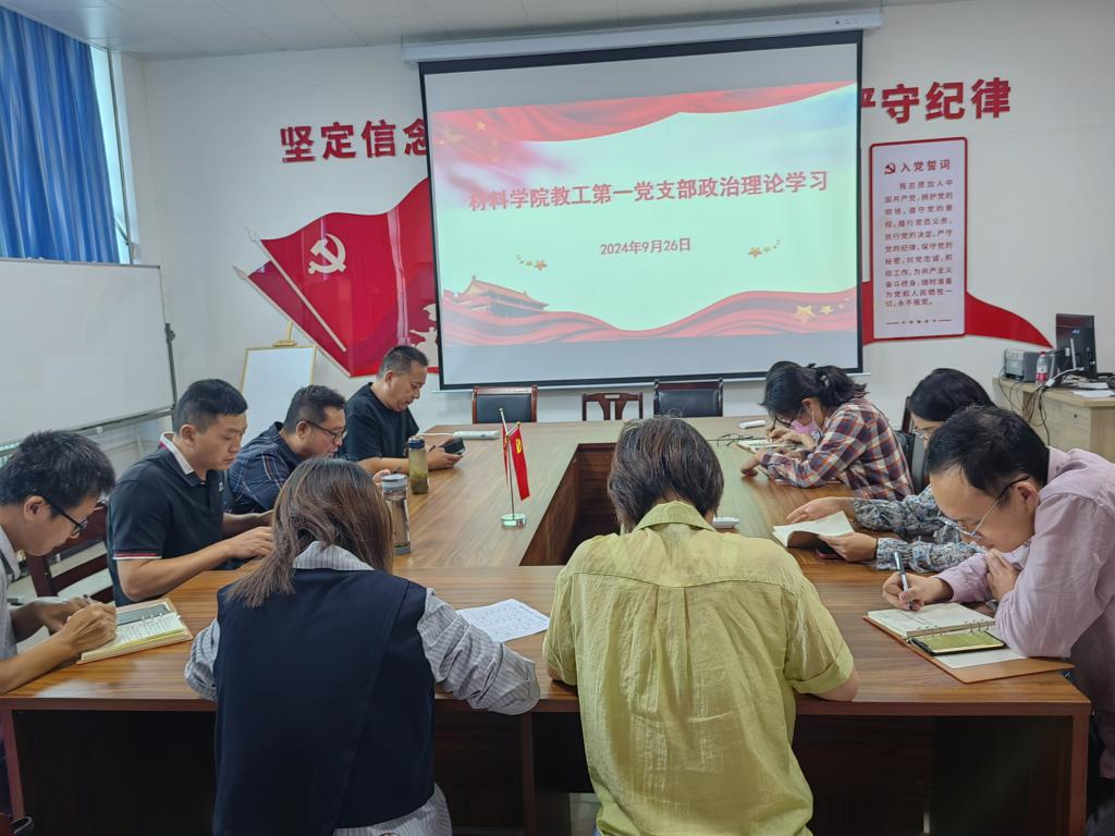 9月26日下午材料学院教工第一党支部在教5楼309开展政治理论学习。教工第一党支部全体教师党员参加会议。会议由支部书记席文昌主持。会议过程中,刘国华领学了习近平总书记关于“培养德智体美劳全面发展的社会主义建设者和接班人”的重要讲话,李泉领学了“从严治党为建设教育强国提供坚强保障--教育部扎实开展党纪学习教育综述”文件。席文昌、田莹莹根据政治理论学习围绕全面育人,严明党纪,建设教育强国,谈了学习体会。席文...