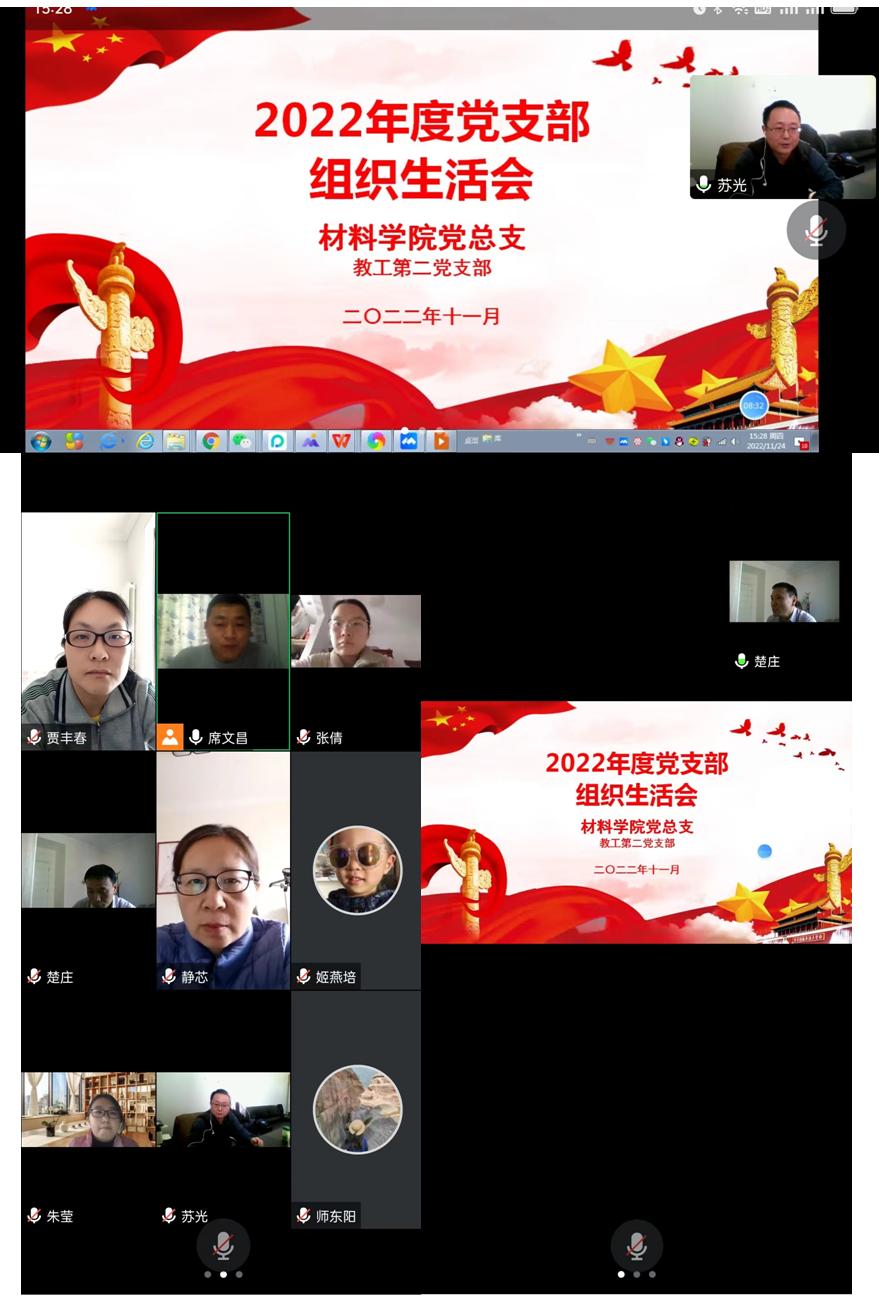 2022年11月24日下午,材料科学与工程学院教工第二党支部通过线上方式开展专题组织生活会,专题学习学习习近平总书记视察安阳重要讲话精神,材料学院院长苏光、党支部书记师东阳副院长及教工第二党支部全体党员参加会议。会议由教工第二党支部组织委员席文昌主持。
