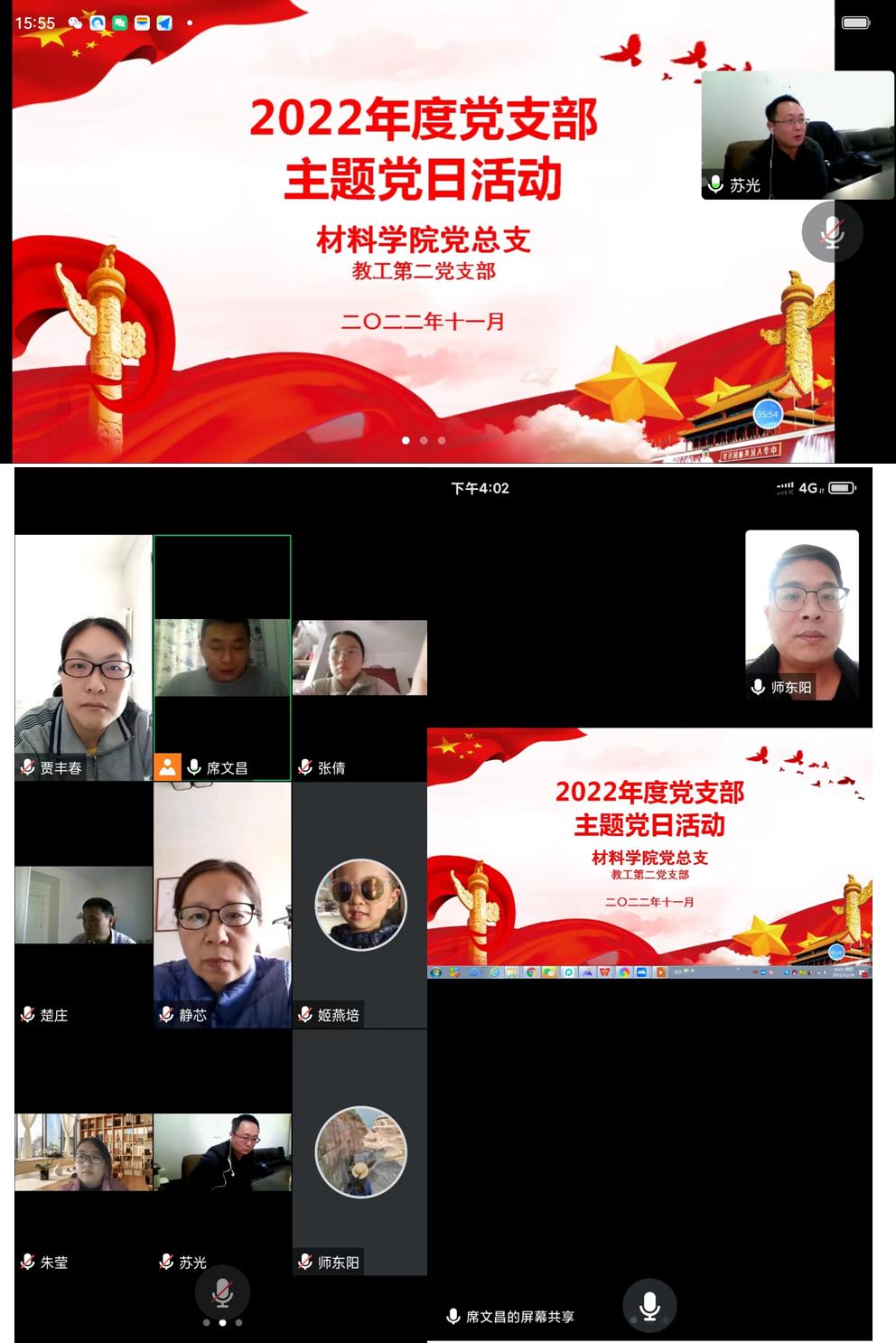 2022年11月24日下午,材料科学与工程学院教工第二党支部利用腾讯会议在线上召开了“学习张世光同志的先进典型事迹,做好本职工作”的主题党日会议。材料学院院长苏光、党支部书记师东阳副院长及教工第二党支部全体党员参加会议。会议由支部委员楚庄主持。