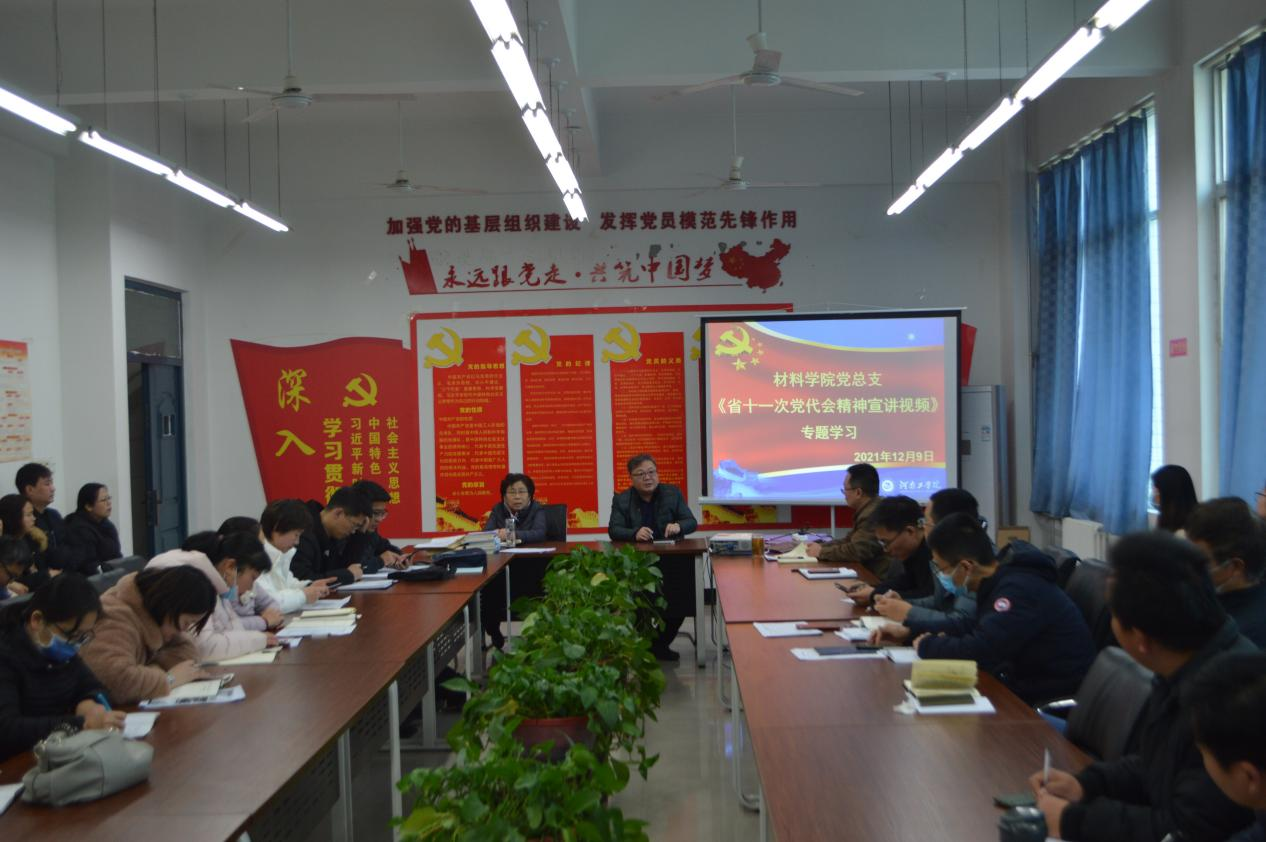 为深入学习贯彻省十一次党代会精神,根据校党史学习教育领导小组《关于学习收看党的十九届六中全会精神、省十一次党代会精神宣讲视频的通知》要求,材料学院党总支于12月9日下午组织全体教职工集体学习河南省十一次党代会精神宣讲视频。