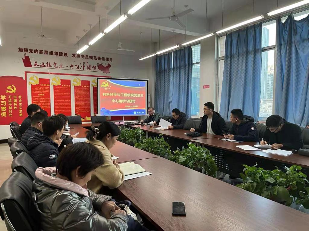 11月30日,材料学院党总支在教5楼305室,以“学习贯彻党的十九届六中全会精神,学史力行,为师生办实事”为主题,组织召开了11月份中心组学习研讨。材料学院全体中心组成员参加了会议,会议由党总支书记贺福利主持。