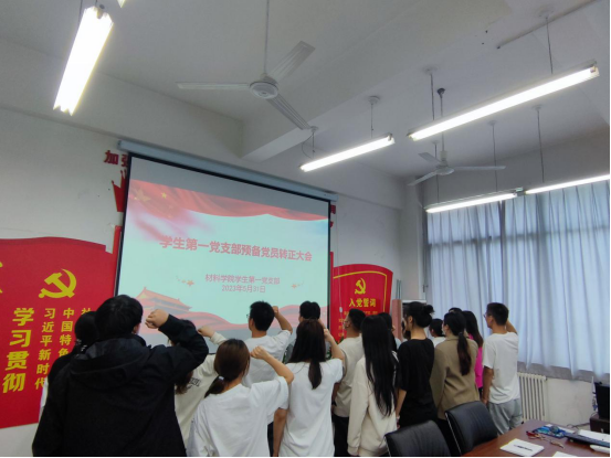 随后,在陈琼璐同志的带领下,16位同志面对鲜红党旗宣读入党誓词。最后,由张庆同志对本次会议进行总结,希望新接收的预备党员及刚转为正式党员的同志们,以高标准要求自己,不仅要加强党史内容的学习,提高党性修养,在平时也要积极发挥党员的带头作用,理论联系实际,把所学的知识应用到日常生活中。
