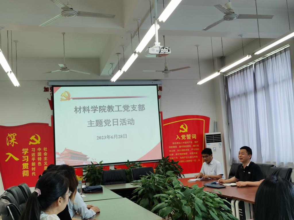 为庆祝中国共产党成立102周年,6月28日下午材料学院教工第一党支部和第二党支部在教5楼305开展学习“以学正风 以查促教”主题党日活动暨政治理论学习活动。院党委书记于明华、副院长朱兴林、副院长师东阳及教工支部全体教师党员参加会议。会议由副院长朱兴林主持。