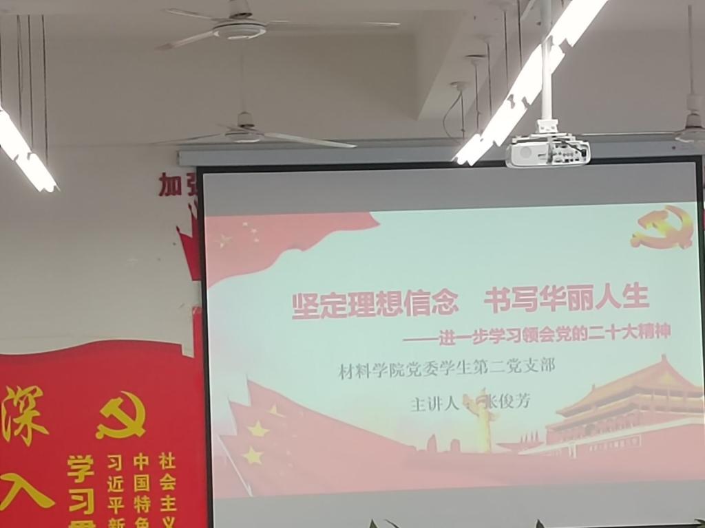 为深入学习贯彻党的二十大精神,5月31日材料学院学生第二党支部书记张俊芳在教学五号楼305室为大家讲授了“坚定理想信念 书写华丽人生——进一步学习领会党的二十大精神”专题党课。支部全体党员共同参会。