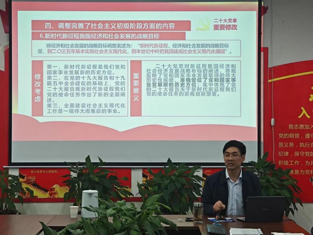 党课上,李贵敏围绕新修订的《中国共产党章程》,从党章修改的原则和重大意义、党章的地位作用和基本结构、党章修改的重点内容、如何学习尊崇党章做合格党员等4个方面,特别针对新党章50处修改之处进行深入浅出的解读,详细讲解了党章的新观点、新论断以及对当前党的基层组织和党员提出的新要求、新任务。李贵敏强调,党章是党内的根本大法。修改党章,事关战略全局,事关人民福祉,事关复兴伟业。这次党章的修订是深入学习巩固党的创新理论的需要、是推进党和国家事业发展的需要、是深入推进新时代党的建设新的伟大工程的需要,也是贯彻落实党的二十大精神的需要。