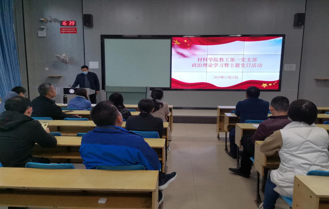 11月23日下午材料学院教工第一党支部在教1楼B101教室开展政治理论学习活动。教工第一党支部全体党员参加会议,会议由支部书记席文昌主持。