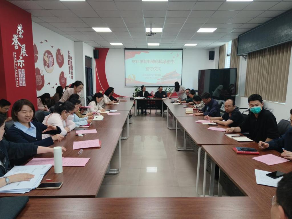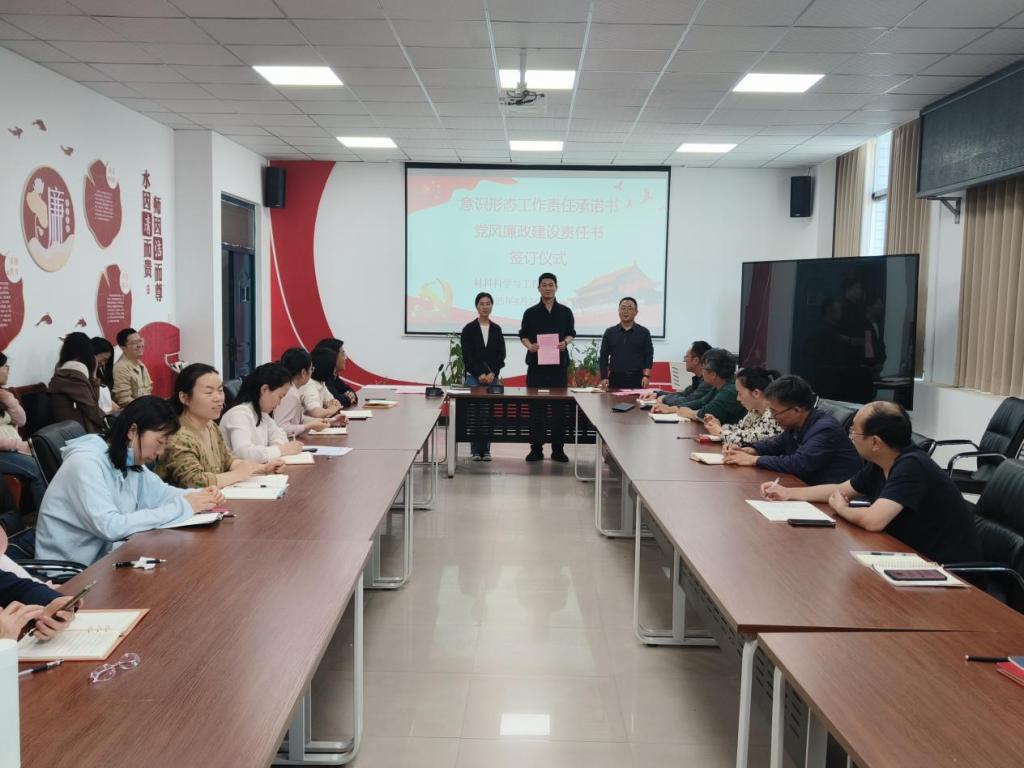 为进一步确保学院意识形态工作、党风廉政建设、师德师风建设落实到位,4月24日,材料学院在教学5号楼305会议室举行2025年度意识形态工作责任承诺书、党风廉政建设责任书和师德师风承诺书签订仪式,全体教师参加会议,会议由党委书记于明华主持。