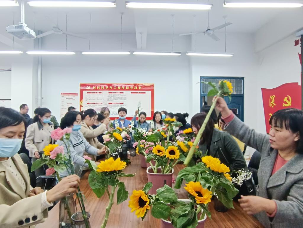 为庆祝“三八”国际劳动妇女节113周年,充分展现材料学院教职工的良好精神风貌,增强学院的凝聚力和向心力,3月9日下午,材料学院分会在教学5号楼305室组织开展了“春暖花开 向阳而生” “三八”妇女节活动,为学院教职工提供一个“与花共舞”、“与花为伴”的机会,在繁忙的工作之余享受花样年华。