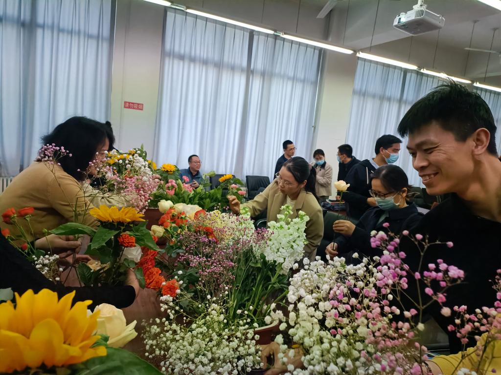 花是传递和平、美好、友谊的使者。主持人李静在开场介绍了所有花代表的寓意,男教工积极参与花意连连看互动环节,女教工在插花环节,充分发挥个人的想象力和创作力,互搓花艺技法,亲手DIY,感受插花艺术的独特魅力。