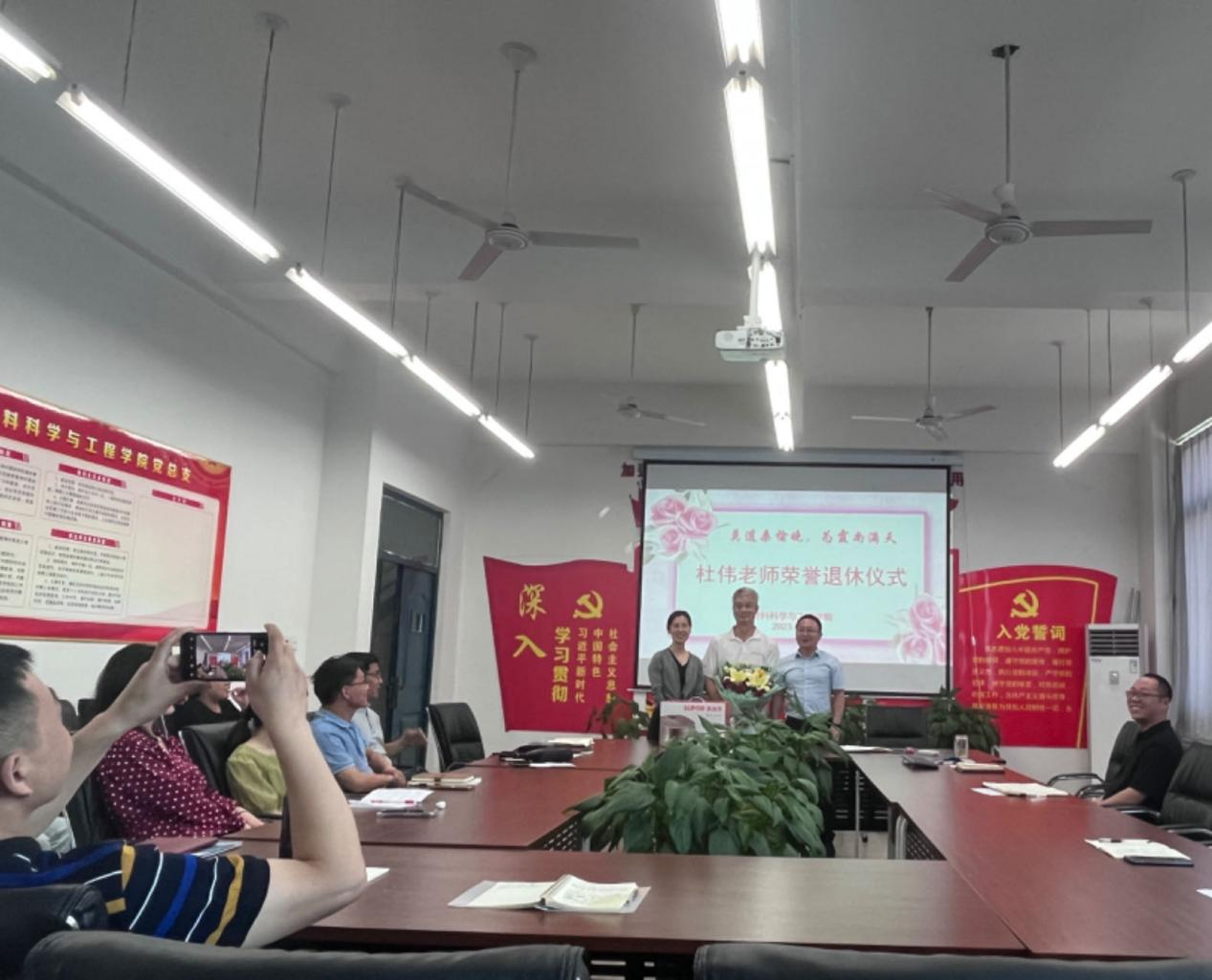 伴随着不舍与祝福,2023年6月15日,材料学院为即将光荣退休的杜伟老师举行欢送会。于明华书记和苏光院长送上鲜花和祝福,对他多年来的工作给予了充分肯定,感谢杜伟老师几十年的孜孜不倦、无私奉献。希望他继续为学院的发展献计献策,欢迎他们常回“家”看看。杜伟老师随即发言,言语中透露出浓浓的感动与不舍,但更多的是对学院的深情祝愿。