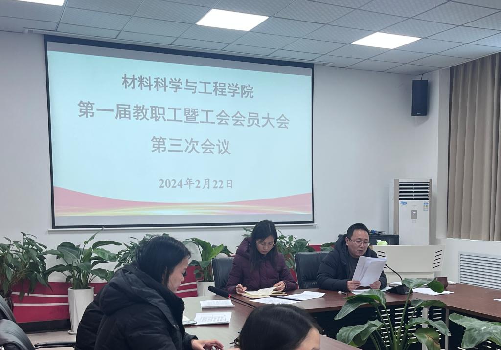 为进一步落实全心全意依靠教职工办学的指导思想,团结、动员广大教师发挥积极性、创造性,促进学院各项工作协调快速发展,2月22日,材料学院在教学5号楼305会议室召开第一届教职工暨工会会员大会第三次会议,学院全体教职工出席大会,会议由学院工会主席周慧琳主持。