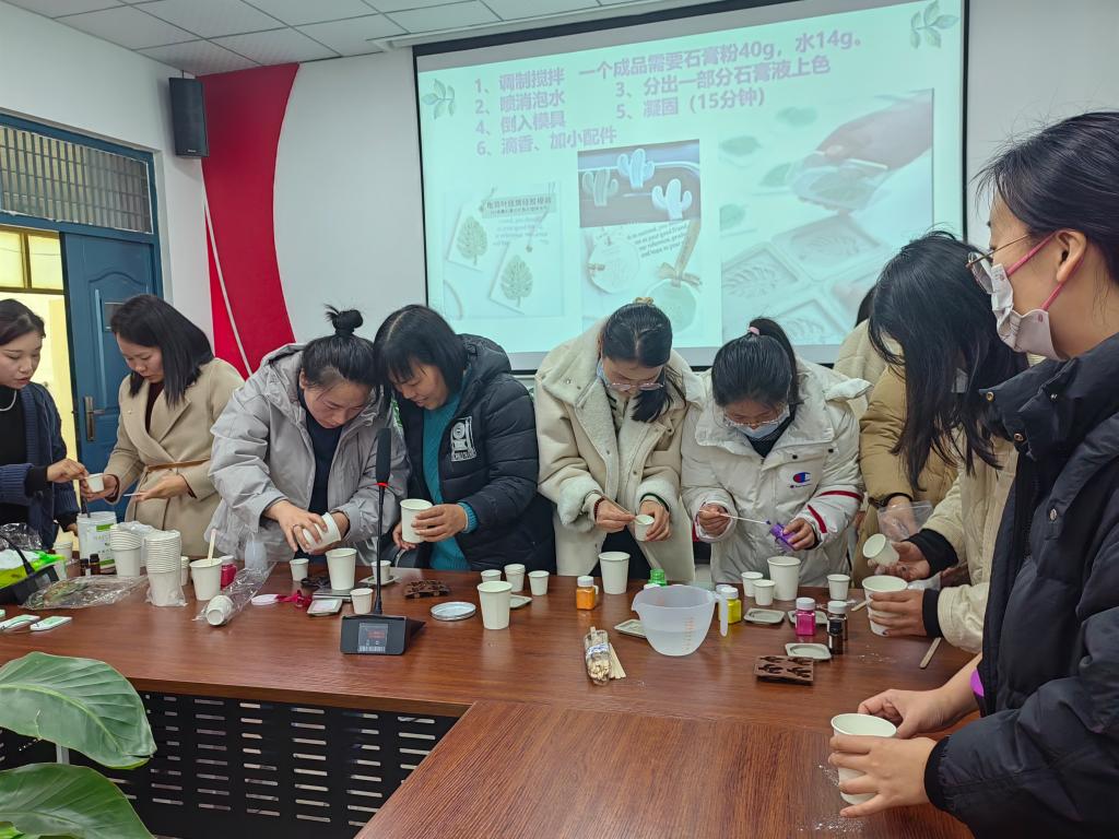 活动开始前,主持人详细讲解了香薰DIY所需的原材料、使用步骤和制作流程。随后,在主持人的指导下老师们开始自由创作。通过搅拌、上色、注模、脱模等步骤,一个个精美又独一无二的香薰石膏牌逐渐呈现出来。石膏牌凝固后,再按照自己喜欢的样式和香味,系上丝带,滴上清香的精油,成为不仅具有芳香魅力,还能净化空气的小礼物。活动现场笑声阵阵,空间里弥漫着淡淡的香气。