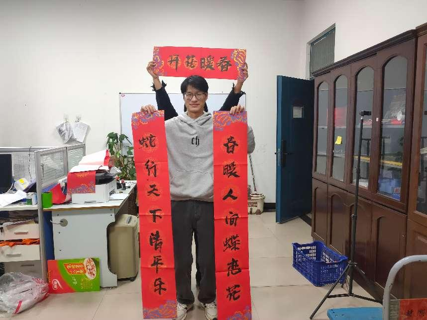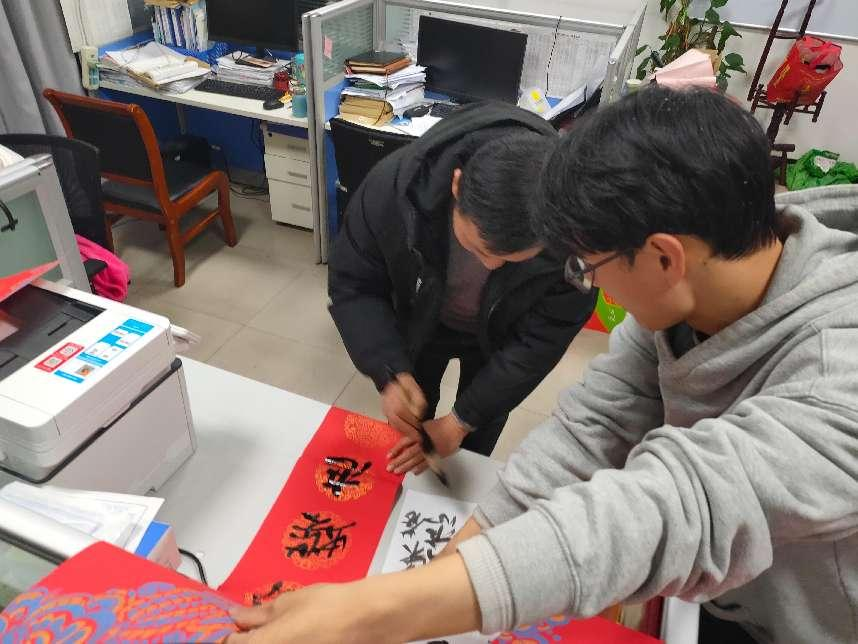 墨香四溢,红纸铺陈。教师们纷纷挥毫泼墨,书写春联、福字及新春寄语,“蛇行天下清平乐,春暖人间蝶恋花”写出了对新年的美好祝愿。活动现场教师们亲切交流,分享书法技巧与新春祝福,欢声笑语不断,一幅幅作品笔力遒劲、寓意深远,展现了教师们深厚的文化底蕴与昂扬向上的精神风貌。
