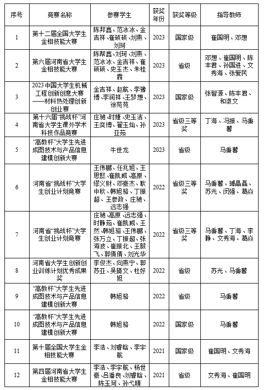 材料加工及改性创新创业团队目前拥有逾200名团队成员。团队从基础课程起步,通过系统的课程学习,确保学生掌握金属材料、高分子材料等关键知识,能够理解常见机械结构,掌握常见机械结构的设计技巧以及绘图技能。通过专业课程的深入学习,巩固基础知识,强化其应用,并通过实践环节如实验实习等增强建模和设备操作等实际能力。通过创新课程,进行系统的创新思维训练,逐步激发创新创业潜能,在各项创新创业大赛和专业技能比赛中不断提升团队的创新创业能力。近年来,团队在“互联网+”大学生创新创业大赛、“挑战杯”大学生创业计划竞赛、“高教杯”大学生先进成图技术与产品信息建模创新大赛、大学生金相技能大赛、中国大学生机械工程创新创意大赛等大赛中获得国家级及省级奖项60余项,申报大学生创新创业训练计划10余项,共开发虚拟仿真软件10余项,已申请软件著作权4项,申报国家专利40余项。