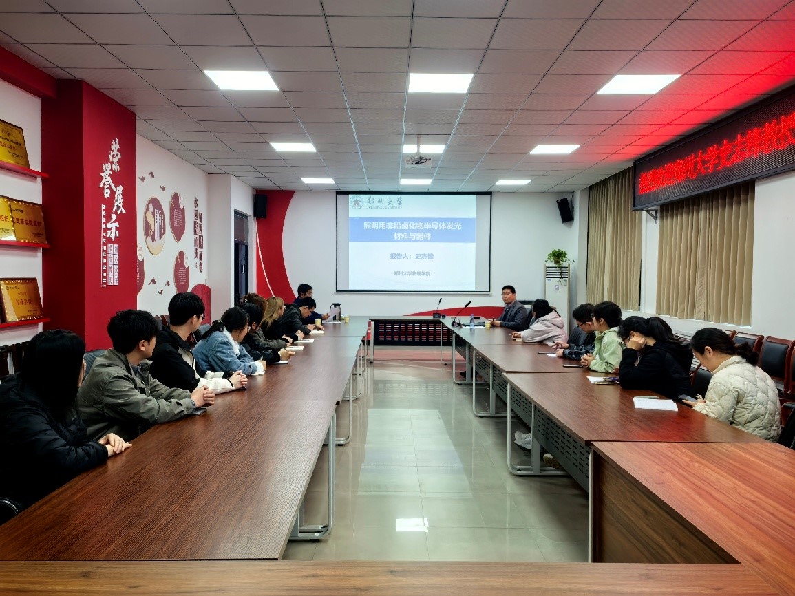 2025年11月7日下午,材料学院在教学5号楼305会议室成功举办学术报告会,特邀郑州大学物理学院博士生导师史志锋教授作题为“非铅卤化物半导体发光材料与器件研究进展”的学术报告。本次报告由材料学院副院长师东阳主持,材料学院全体博士、新能源材料与器件专业全体教师及学生共同参与,现场学术氛围浓厚,交流热烈。