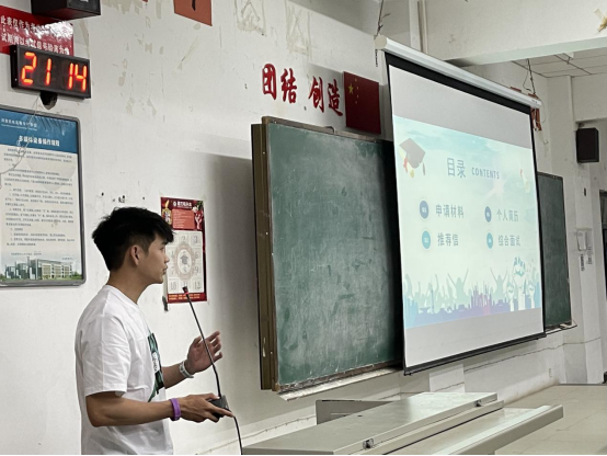 会上,周书记指出,考研需要付出艰辛的努力,希望同学们可以在备战考研的过程中始终保持信心和恒心。敢于面对困难,又要善于解决困难,在遇到问题时可以向学长学姐或同学老师们寻求帮助,只有不断吸取成功经验,同学们才能少走弯路。朱院长表示学院将在专业课学习、报考院校指导、调剂建议等方面,给予同学们全方位的支持。第一位主讲人是向燕宁同学。她结合自身经历告诉我们,是要根据自身实力和兴趣去选择考研学校和方向。第二位主讲人是韩宇同学,她为同学们分享了专业课、英语及政治的复习节奏以及答题技巧。第三位主讲人是田金科同学,他提到英语的阅读复习最重要的是往年真题,并建议同学们进行多次真题训练,以此巩固基础、理清思路、熟悉手感。在作文准备上,他建议大家将作文学习分为背诵、默写、练习三个环节,借此完善英语作文的成文思路与行文思维。赵嘉欣同学从她跨考教育学的经历,给大家分享了备考科目的复习重点及学习方法。程秀云同学告诫同学们不要迷信经验帖,在学习中要找到适合自己的规律方法,拒绝疲劳战。最后一位同学是李佳,他主要给同学们分享了申请国外学校的流程,比如推荐信、简历及语言成绩,最后勉励大家“道阻且长,行则将至,行而不辍,未来可期”。