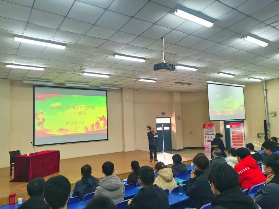 12月15日,我院与智能学院、电缆学院联合举办了大学生应征入伍政策宣讲会,学工部部长、武装部部长朱松梅、国防教育办公室老师万林宾应邀作了宣讲,我院70余名学生代表参加了本次宣讲会,我院党总支书记贺福利出席了宣讲会。