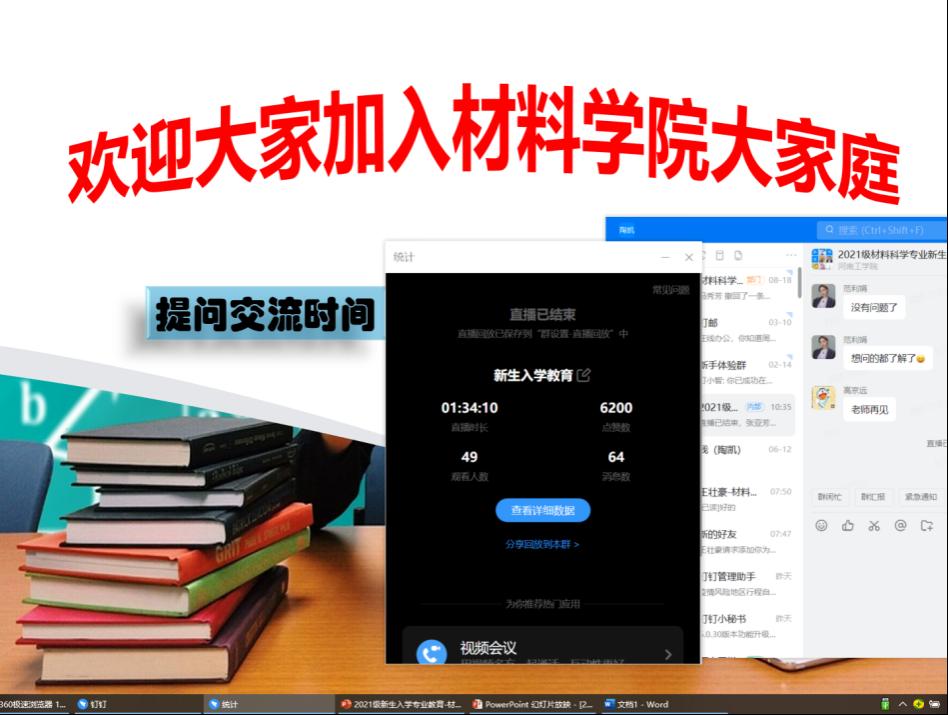9月14日上午,我院材料科学与工程专业教研室组织开展了2021级新生入学的线上专业教育。教研室主任陶凯老师通过钉钉直播平台对材料科学与工程专业新生就学校及学院简介、专业简介、培养方案、专业特色、深造、就业情况等多方面的内容进行了细致讲解,并通过直播平台进行了线上讨论答疑。同学们通过线上平台认真听讲,积极互动。
