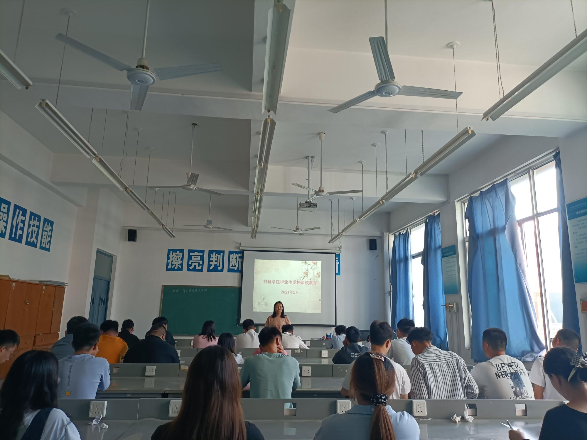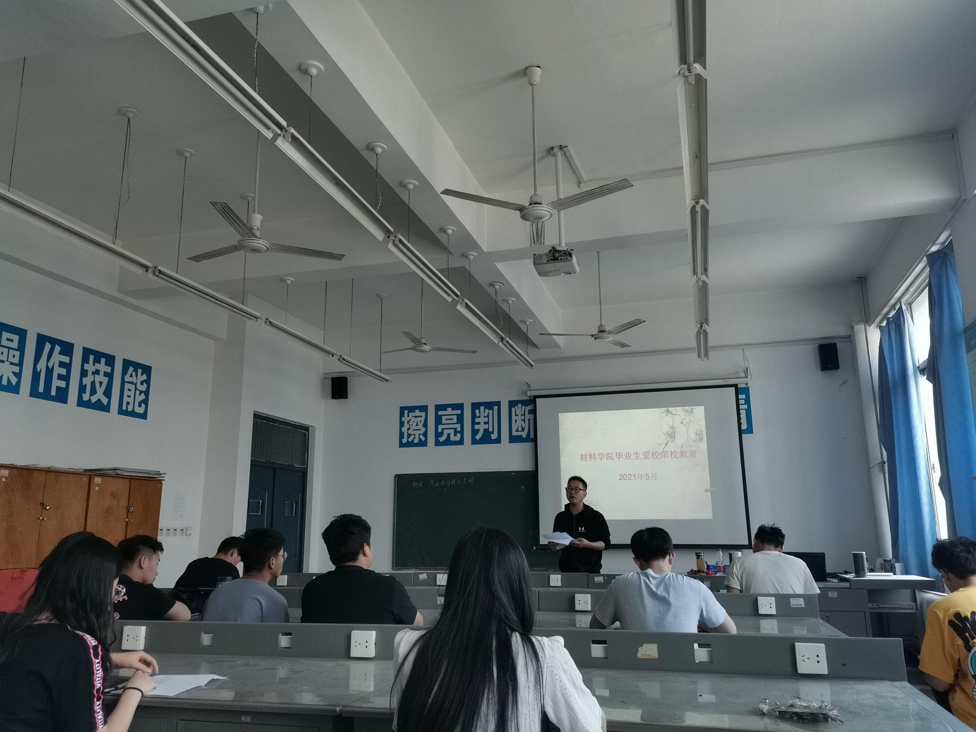 为加强爱校荣校教育,弘扬校园文化精神,材料学院于5月17日在教学五号楼204室召开了爱校荣校教育主题班会。我院2021届毕业生参加了会议,会议由毕业班辅导员张庆、张俊芳主持。