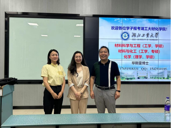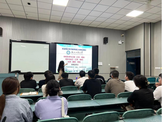 会议伊始,毕斯雯博士向与会人员介绍了湖北工业大学的基本情况,并从发展历程、培养方向、奖学金情况、科研平台、科研成果、团队介绍等方面介绍了湖北工业大学材化学院近年来发展取得的成果。同时对湖北工业大学材化学院研究生培养方案、资助体系作了详细解读,鼓励学生积极报考湖北工业大学材化学院研究生。现场气氛热烈,学生与毕斯雯博士积极互动,同学们都表示本次宣讲会受益匪浅。