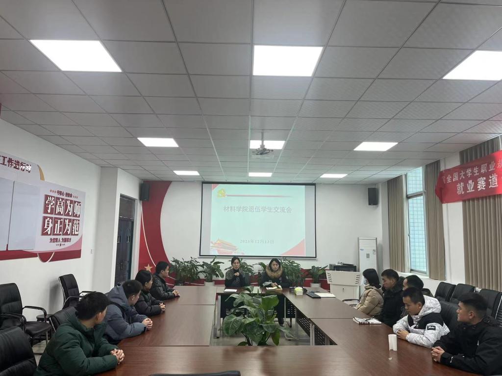为积极响应国家政策,关心关爱退役学生,扎实做好退役学生服务工作,营造爱军拥军浓厚氛围,鼓励退役大学生积极践行责任担当,12月13日,材料学院在教5楼305室召开退伍学生交流会。学院党委书记于明华,党委副书记周慧琳,征兵工作负责老师张庆及材料学院全体退伍学生出席本次交流会。