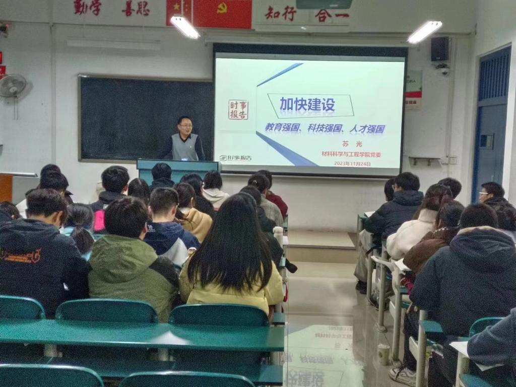 苏光结合我院特色和学生实际,从四个方面进行阐述:一是着眼长远发展的重大抉择;二是铸就强国建设的坚实基础;三是加快强国建设的战略部署;四是充分发挥高校的重要作用。强调人才是国家长远发展的重要支撑,是实现民族振兴、赢得竞争主动的战略资源,教育是人才发展中不可或缺的一部分。希望同学们努力学习科学文化知识,积极参加各种科研和实践活动,不断培养创新能力,全面提升自身的思想素质和综合能力,以青春之我、奋斗之我,为祖国的繁荣昌盛添砖加瓦,让青春在为祖国、为人民、为民族、为人类的奉献中焕发出更加绚丽的光彩!