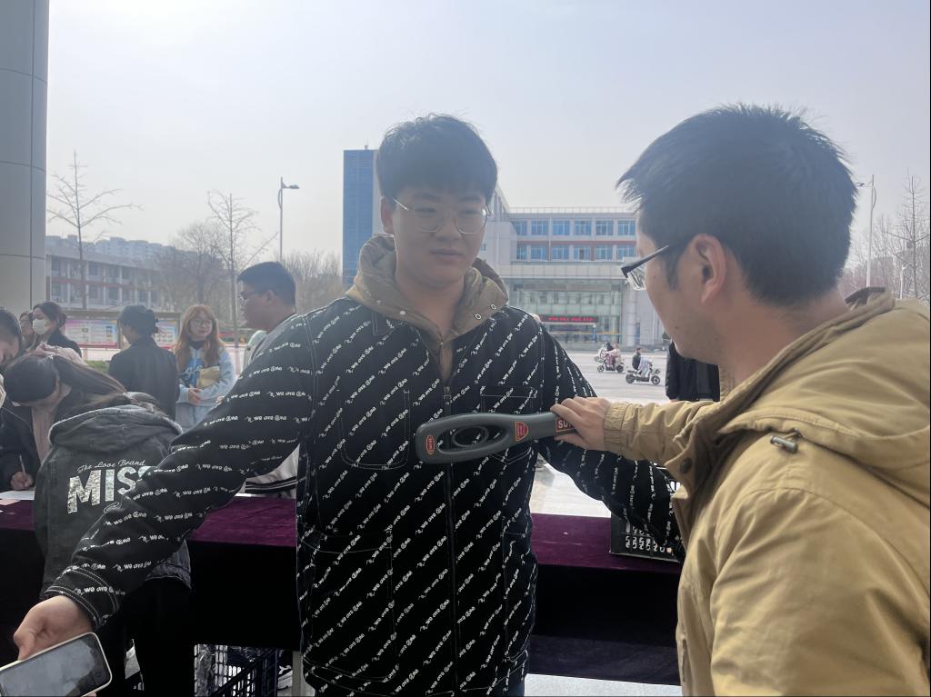 首先,张庆老师向同学们强调了考试纪律,讲述了诚信考试的重要性和必要性,详细说明了考试作弊的严重后果,要求所有学生自觉遵守考试管理规定和考场纪律,服从监考老师的安排。然后解释了“无声入场”规则并进行了模拟演练,在演练中,同学们积极配合,按照入场秩序,使用金属探测仪按照从正面至背面、从上到下的顺序进行详细检测,保证"人人过关",确保"无声"通过。对于演练过程中发现的不合格现象,老师及时给予提醒纠正。
