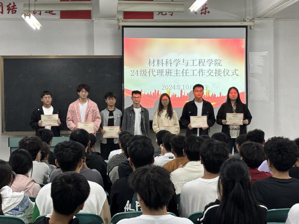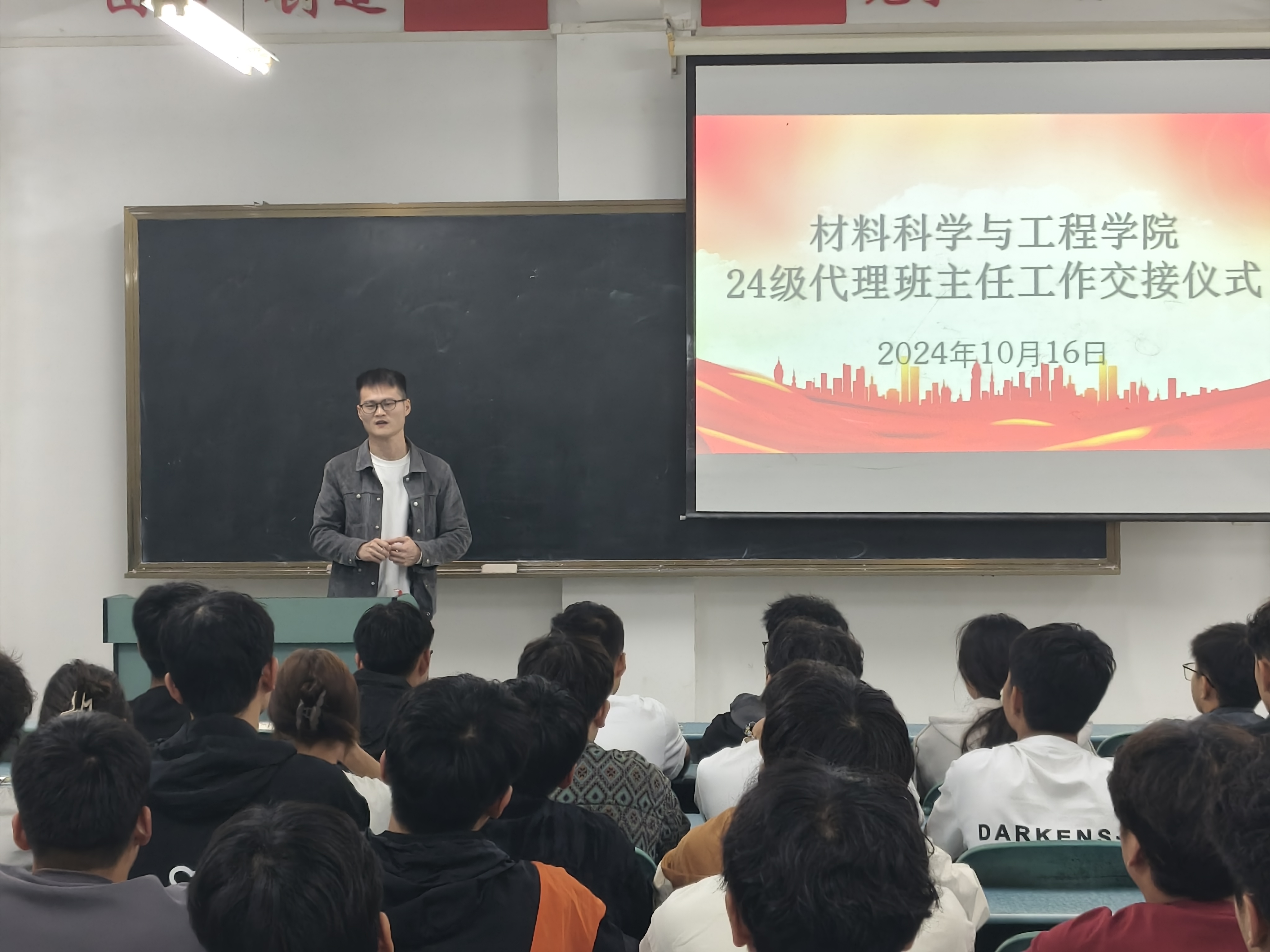 为使2024级新生各班班委更好、更快地进行管理班级,培养班委的组织管理能力和沟通技巧。材料学院于10月16号晚上8:40在教学一号楼B401举办了24级代理班主任工作交接仪式,本次仪式由叶好运老师主持。