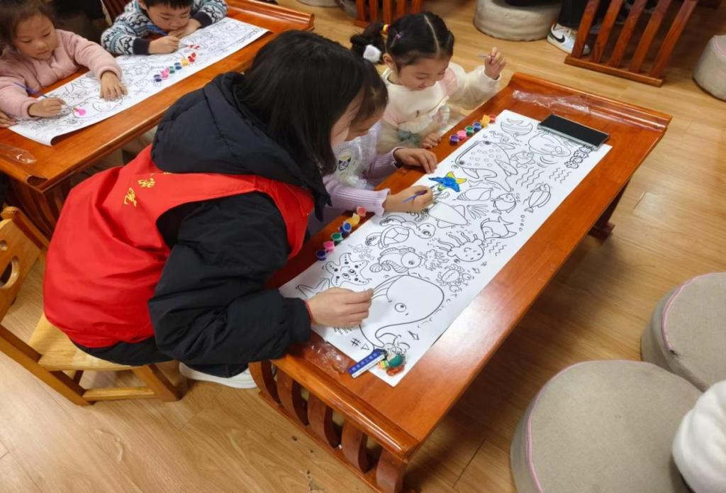 活动日当天下午,参与此次活动的全体志愿者集合签到后,由负责人分工,随即开始此次志愿活动。活动期间,志愿者们分组合作,在与幼儿一对一交流的绘画过程中,依据幼儿的想法提出一些创意性的建议,引导和鼓励幼儿大胆发挥想象力创作,同时教导幼儿正确握笔、画简单线条和学习不同形状绘画方法,助力幼儿更好地表达想法。活动最后,负责人整理绘画工具,清理完场地后,对志愿者进行点名,全体合照,本次活动自此结束。
