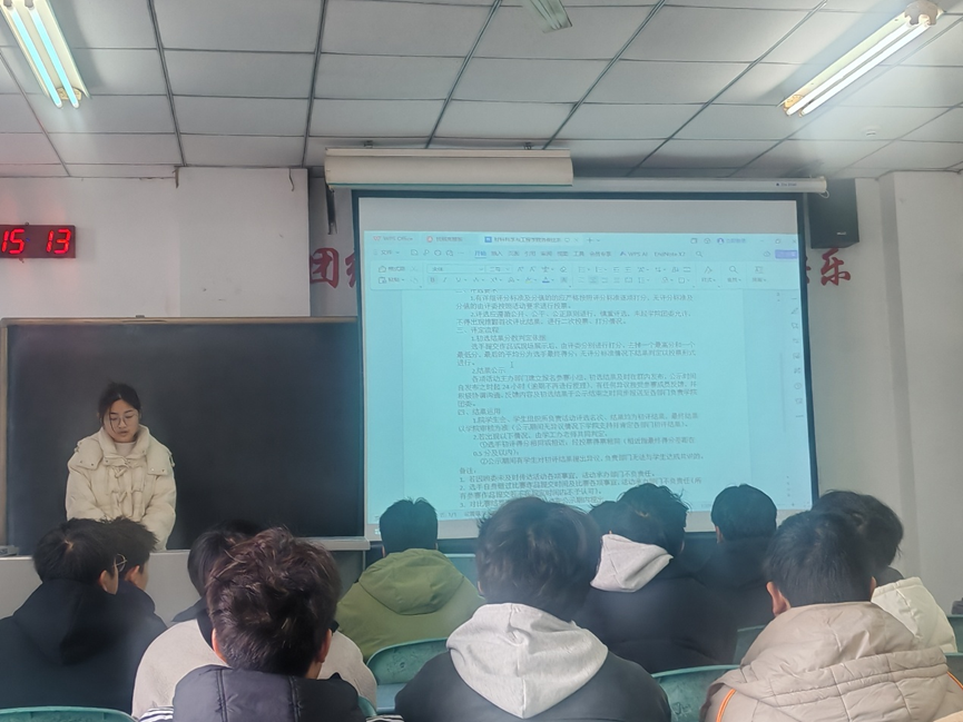 会前,徐卫珍老师与材料学院学术部成员精心策划,整合培训材料,确保学委们准时参会。培训会上,学术部主席吴涛首先阐述了培训的目的与重要性,强调学委在班级中传达学分知识的桥梁作用。随后,学生部负责人姚银静通过PPT详细讲解了不同年级申报所需材料、学分上限要求及新增申报内容,特别针对往届学生申报中出现的漏报、误报问题进行了重点解析。学术部负责人王梦欣进一步补充说明了材料学院各类活动的评比标准。最后,吴涛主席对培训内容进行了总结与补充。