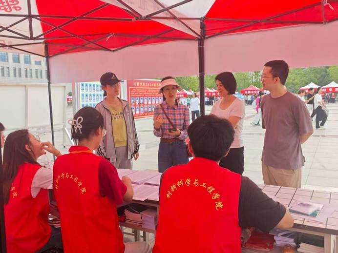 在迎新服务台,学院领导班子成员与新生及家长展开了深入交流。“孩子这个专业主要学些什么?、就业前景怎么样?”一位家长关切地问道。院长苏光耐心细致地介绍了材料科学与工程专业的课程体系——从基础的材料科学理论,到前沿的材料研发技术,层层递进、清晰解读;同时再次强调,学院始终致力于营造浓厚学术氛围、培育积极向上的学风,以优异的考研成果为抓手,持续带动学风建设,形成“勤学善思、知行合一”的良好学习风气。此外,学院领导班子还详细询问新生报到是否顺利,耐心解答校园生活、学业规划等各类疑问,鼓励新生尽快适应大学节奏,在材料学科领域深耕细作、追求卓越。