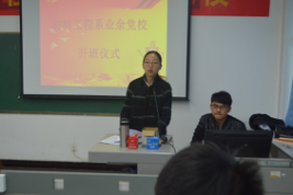 在雄壮的国歌声中开班仪式拉开了序幕。首先是大二学生代表董丽敏上台演讲,共勉我们在党的道路上通过重重考验,勇往直前。稍后,王海燕老师进行今后党课的内容安排,同学们都认真地做着笔记。